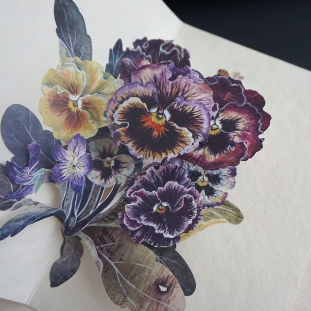 H:155mm × W:100mm(見開き155×200) ーーーーーーーーーーーーーーーーーーーーー 色々な仕掛けを盛り込んだ、パンジー・ビオラ・菫の カードサイズのポップアップ作品です。 こちらに顔を向けて話しかけているようなパンジーやビオラ。 その足元でひっそりと首をもたげる小さな菫。 ひっそりと蜂もやってきます。 そしてそれらが動くことができるのは、 虫喰いの葉があってこそ。 組み立ては、手にしてくれた方がそのままで既に咲いていることを思い出せるようにという気持ちを込めて行いました。 また、今回新しく作り直すのをきっかけに、一部の花を描き直しました。 より引力の高まったビオラのポップアップ作品、 そのままで飾ったり、大切な方へメッセージを書いて贈ったりしていただけたら嬉しいです。 濃藍色またはグレー色の封筒1枚をお付けしてお届けいたします。 Hiromi Takeda
