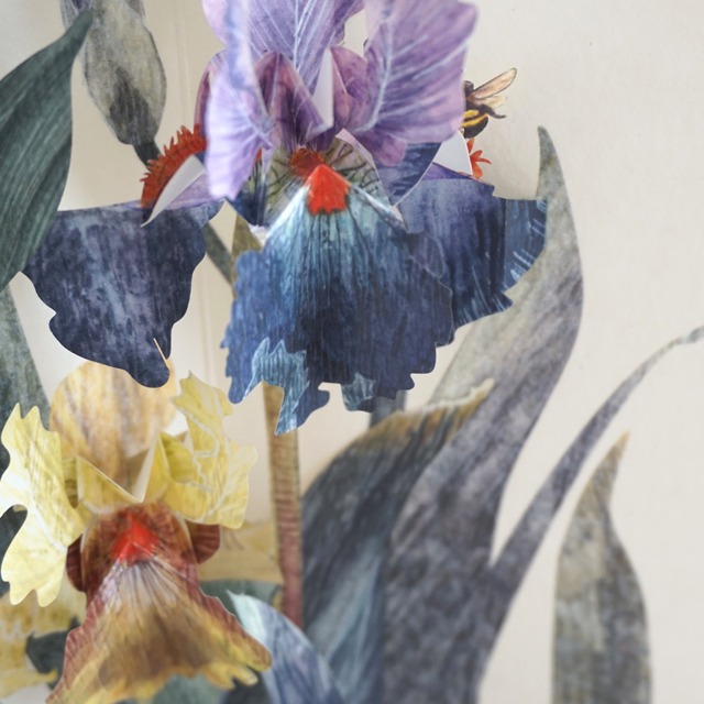 H:155mm × W:100mm(見開き155×200) ーーーーーーーーーーーーーーーーーーーーー 私にとって特別な日。 それは2013年の8月8日。 誰よりも尊敬するイギリスのペーパーエンジニア、 Keith Moseley氏にお会いできた日です。 この型紙は あの日Keith氏のお家の庭に咲いていた ジャーマンアイリスがモチーフで、 実際にKeith氏に型紙を見せ添削してもらった 唯一の型紙の縮小版です。 この花を見ると私は、 Keith氏と対面した時に全身で感じた あの初めての類の気持ちや 設計の美学や未知の仕掛けを教わった時のこと、 そしてその時同時にお会いできた 100歳のお誕生日を迎えられたばかりの女性から こっそり人生の秘訣を教わった時の事を思い出して びゅんとあの異次元な時空間に戻ります。 組み立てでは 手にしてくれた方がそのままで既に咲いていることを ちゃんと思い出せますようにという気持ちを 私なりに込めています。 そのままで飾っても、大切な方へメッセージを書いて贈っても。 薄灰色の封筒をお付けしています。 Hiromi Takeda