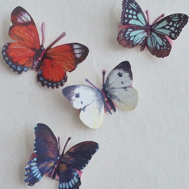 縦 約30mm✕横 40mmの蝶:4羽 ーーーーーーーーーーーーーーーーーー ポップアップの部品として使っていた蝶のパーツを 壁に貼って飾れるようにしました。 深緑の厚紙には マスキングテープを丸めて蝶パーツを貼り付けていますので それを静かに厚紙から剥がし(蝶の触覚が折れ無いようにお気をつけください)、 蝶の台紙の裏面に壁用の両面テープ等を貼った後、 お好きな壁などに貼ることで 4種の蝶の羽を休ませてあげてください。 ふと目に入る場所に蝶たちが集まり休んでいる光景には、 ふふふふと声が聞こえてきそうです。 個人的には、 箱の蓋の端に貼るのも好きです。 Hiromi Takeda