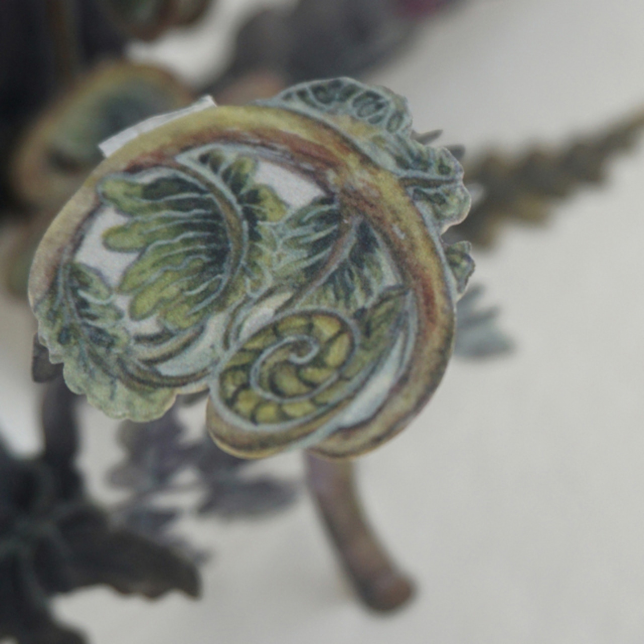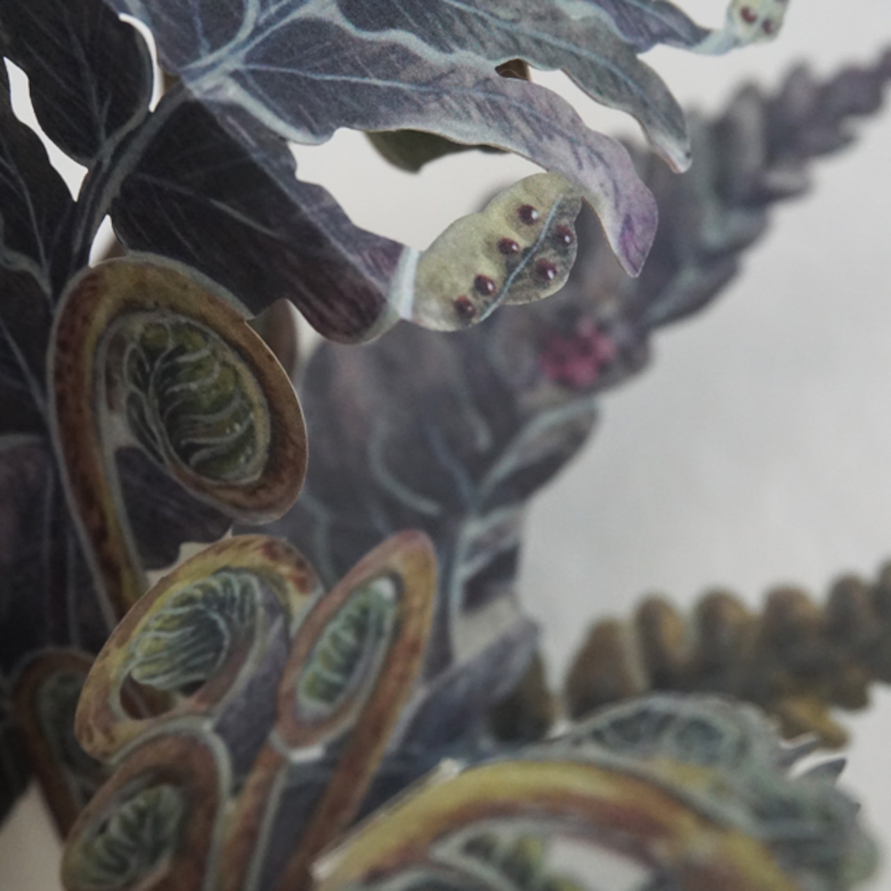魅惑的な波型の葉の形状こそが開閉の際あちこちで絡まりパーツが折れたりちぎれたりするので、パーツの空間的な動線をいかに正確に把握し、見い出した抜け道に高確率で通過させるためにはどうするか。台紙の強度との関係性も感じられるようになるまで大分失敗や作り直しをしました。それらは実に楽しい時間でした。