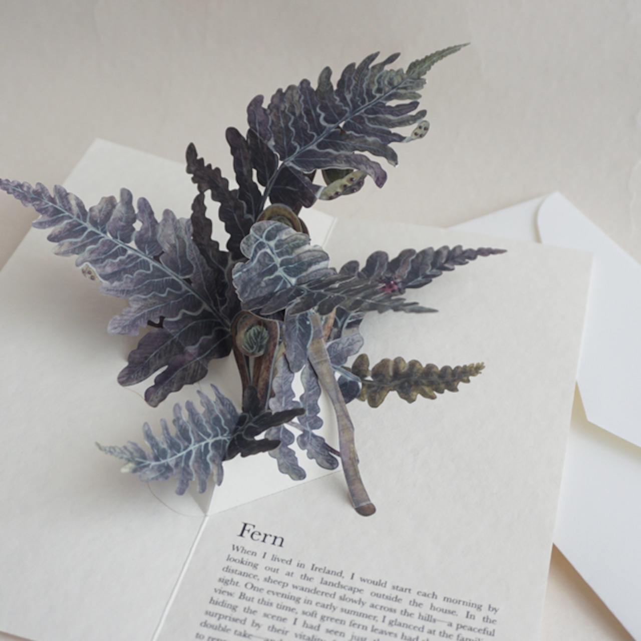 シダ植物は、私がアイルランドで感じたように生命の力強さを意味する植物でもあるようです。常に緑の葉を広げるシダ植物。静かに強く、知らぬ間に地面から立ち上がってゆくシダの力強さが、これから貴方が向かってゆく日々の始まりを応援し、閉じる時には生きてゆく力を閉じ込め、また貴方の手で開かれる時、ご自身の力を手の内で感じ思い出していただけますように。