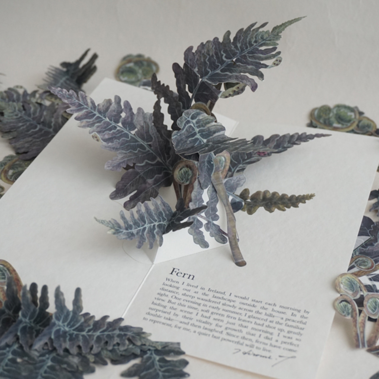 アイルランドに住んでいた頃、毎朝家の外の風景を眺めることが日課でした。遠くに見える丘では羊たちがゆっくりと歩いていて、とても幸せな風景でした。しかしある初夏の日の夕方いつもの景色に目をやると、今朝眺めていた風景が、日中一気に伸びた庭のシダの葉たちによって覆い隠されていることに気がつきました。シダたちのあまりの生命力に驚いた私はこれ以上ない程の完璧な二度見をし、思わず吹き出してしまいました。それ以来私にとってシダという植物は、静かに且つ強く生きる力を思い起こさせてくれる存在です。