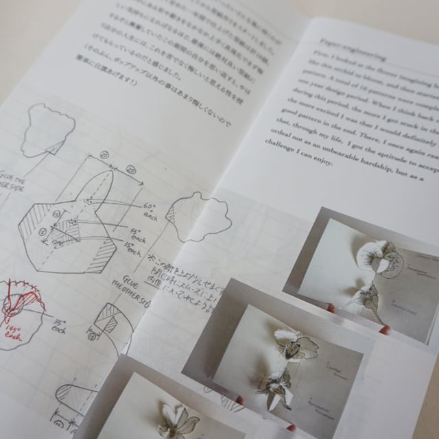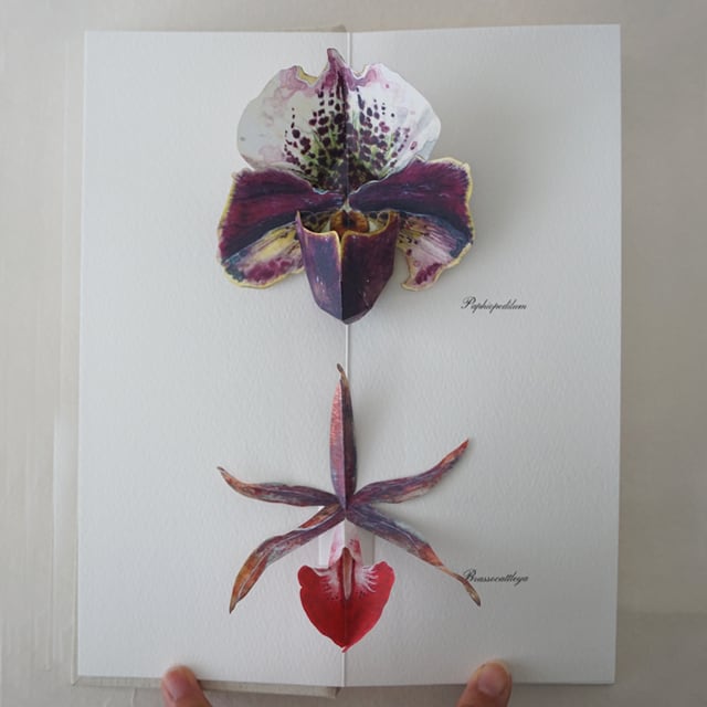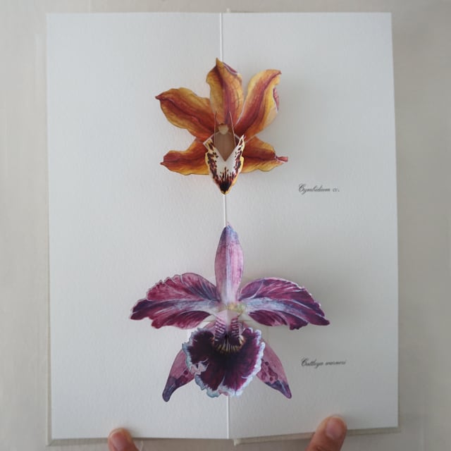 2021年が始まったばかりのある日、蘭の花には想像以上に多くの種類が存在することを知った私は、そのそれぞれに引力ある静かな佇まいや思いを秘めたような表情の一つ一つをポップアップで表現することが、次の自分のミッションだと強く感じました。設計を開始してから完成まで約2年。この作品は、全12種類の蘭の花をそれぞれ違う仕掛けによって表現し、咲かせる標本としてまとめたポップアップです。
